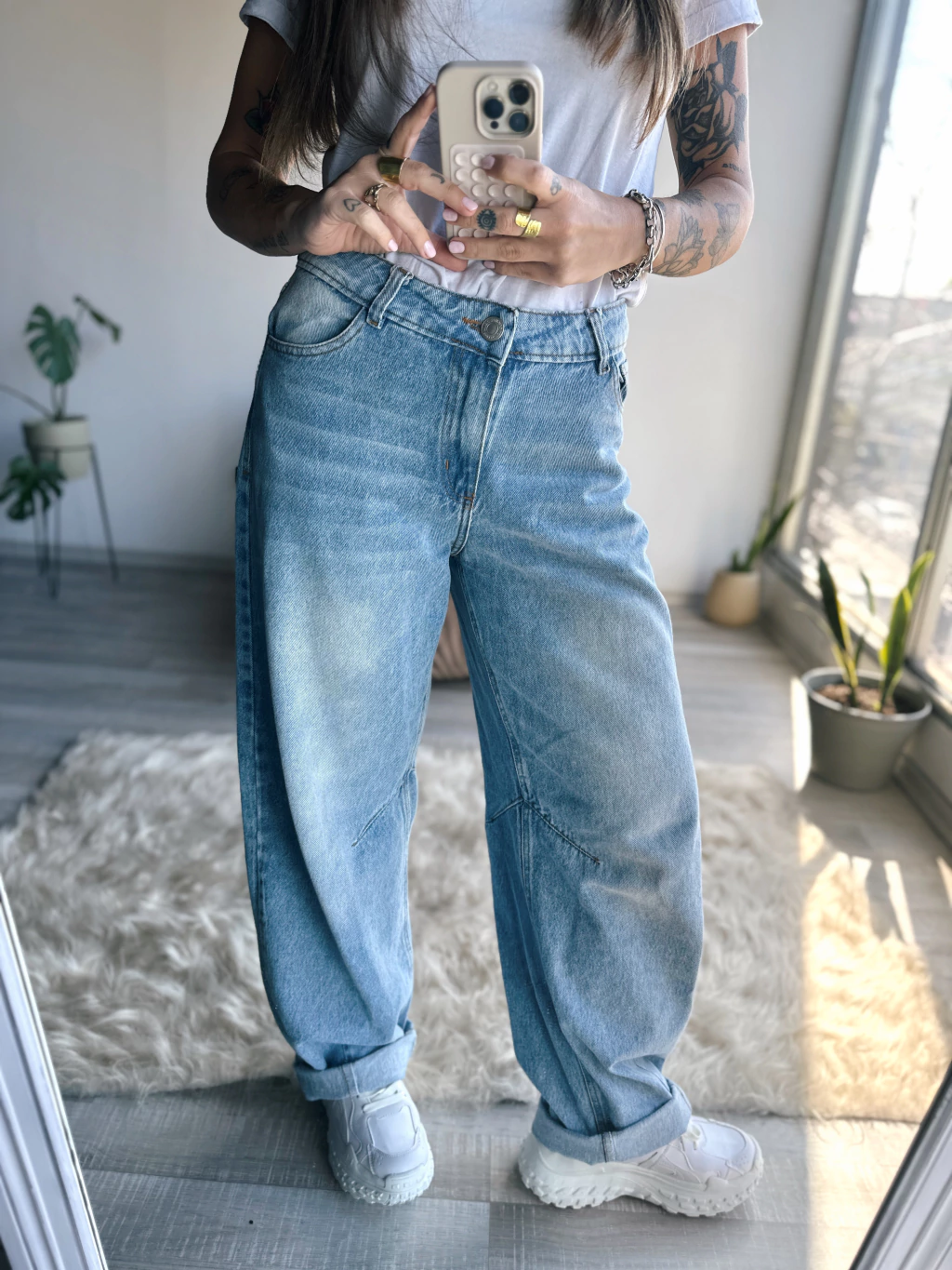 El Jean Barrel Aura redefine el denim clásico con un calce moderno y relajado. De tiro medio, con piernas redondeadas y levemente afinadas hacia el tobillo, logra una silueta única que se adapta a todos los cuerpos sin perder forma.